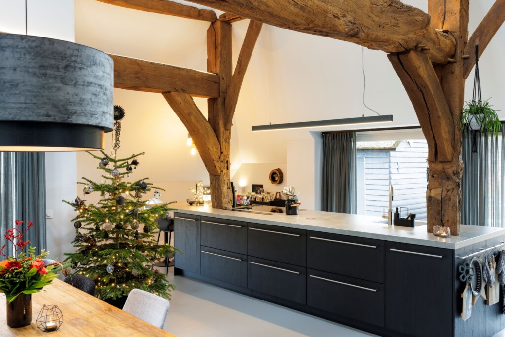 Wat nu het meest in het oog springt in het interieur is het stoere gebint. Warm, in contrast met de strakke basis die het huis inmiddels heeft, en volop in het zicht. “Dit huis staat bekend als het huis met de gebinten”, legt Rieks uit. We vonden belangrijk om dat zo te houden, met respect voor het verleden.” Op de deel heeft het gebint alle ruimte gekregen. Het keukenblok is zelfs helemaal om twee staanders heen gebouwd. “Ze zijn niet afgezaagd, maar lopen onder het aanrecht gewoon door. Ter hoogte van het aanrechtblad is er een rand weggefreesd, waardoor het lijkt alsof het gebint op het blad staat, maar in werkelijkheid loopt het in de kastjes door. Die kastjes zijn daardoor wel wat minder diep, maar die ruimte geven we er graag voor op!”, vertelt Marion.