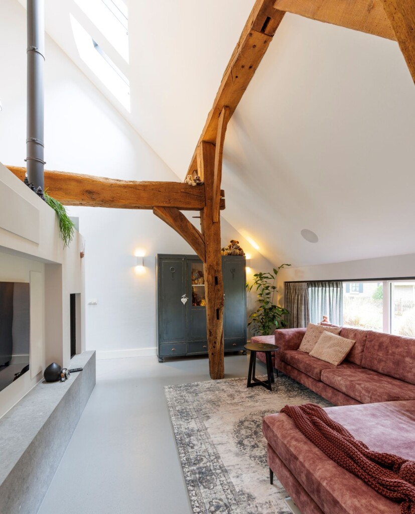 Tijdens de verbouwing ontdekten Marion en Rieks dat er niet altijd met hetzelfde respect met het gebint is omgesprongen. “Toen we begonnen met breken, bleek het door te zijn gezaagd op enkele plaatsen waar muren de draagfunctie over konden nemen. We besloten om het te herstellen. Onze aannemer wist daarvoor vervangende gebinten te vinden die uit andere boerderijen kwamen. Met zorg werd een goede match gevonden. Er is zelfs een keer zo’n zware balk hierheen gebracht, maar de aannemer vond hem niet goed genoeg passen. Pas toen hij helemaal tevreden was over de kleur en de dikte, werd het hier door de timmerlieden ter plekke op maat gemaakt. Op de grond werd het uitgemeten, gezaagd en gefreesd. Gaten voor de pen-gatverbindingen werden op de millimeter nauwkeurig aangebracht. Prachtig om dat vakwerk te zien!”, vertellen ze vol bewondering.