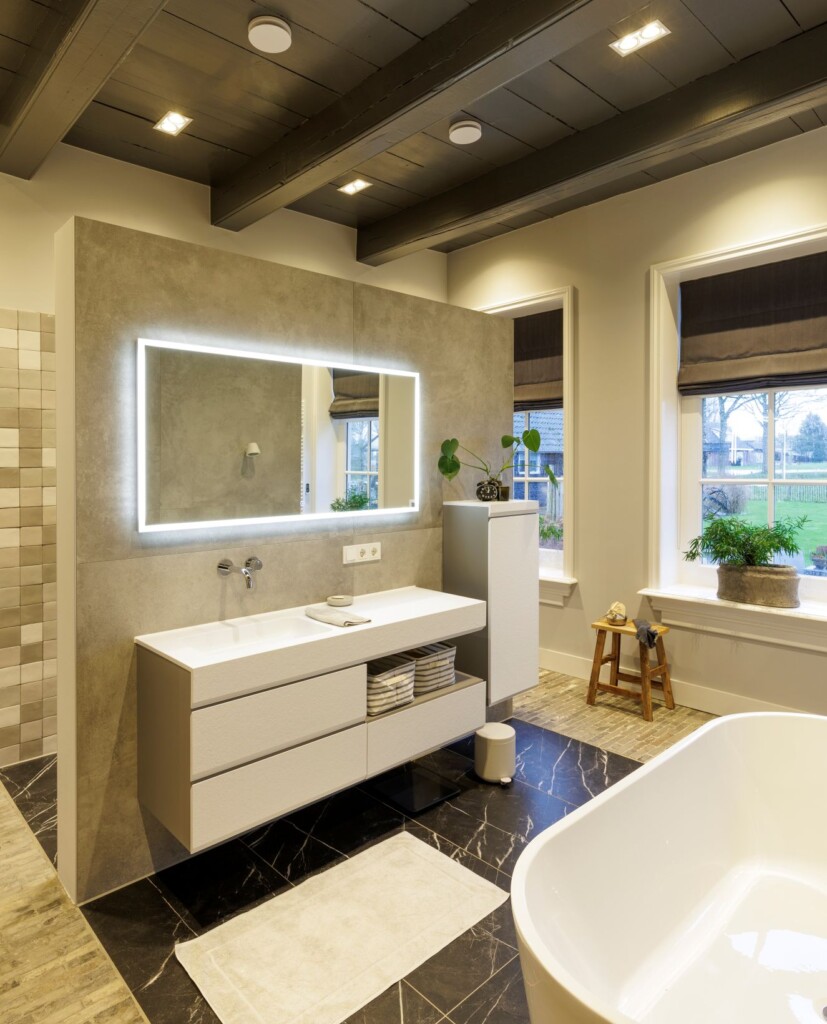 Bij de aankoop voelde het huis benauwd. Marion: “Wij hebben de indeling flink aangepast: de trap naar de gang verplaatst, een ruime woonkeuken met veel licht en alleen een haard als room divider in de ruimte, waarachter we een knusse woonkamer hebben. In het voorhuis zaten voorheen twee slaapkamers, een badkamer en een gang. Daar hebben we nu één grote ruimte van gemaakt met een slaapkamer en een badkamer die daarin doorloopt. Onder het verlaagde plafond kwam nog een oud balkenplafond tevoorschijn, dat we gelukkig in ere konden herstellen.” Het schilderen en schuren was een megaklus, maar het resultaat mag er zijn.
