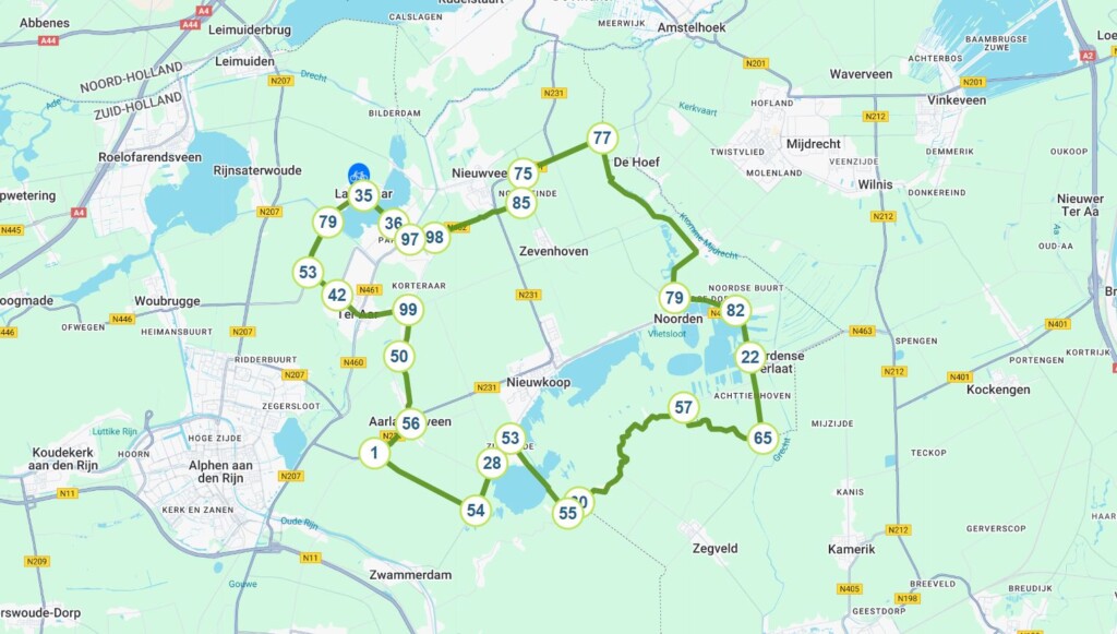 Vanaf parkeerplaats: ga rechtsaf op de G. van Dijkstraat, sla linksaf op de Langeraarseweg naar knooppunt 35.