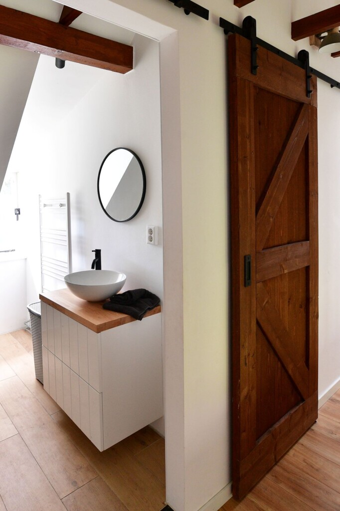 De indeling van het huis is grotendeels gebleven; dat kon niet anders. De oude houtkachel in de woonkamer mocht blijven. Verder is alles aangepast aan hun wensen. Op de bovenverdieping is alles vernieuwd. Er werd geïsoleerd, plafonds verdwenen en de oude hanenbalken kwamen weer in het zicht. Dennis: “Dat gaf meteen karakter én ruimte.” Op de overloop kozen ze voor stoere, hangende, zogenaamde ‘barndoors’ om ruimte te besparen.