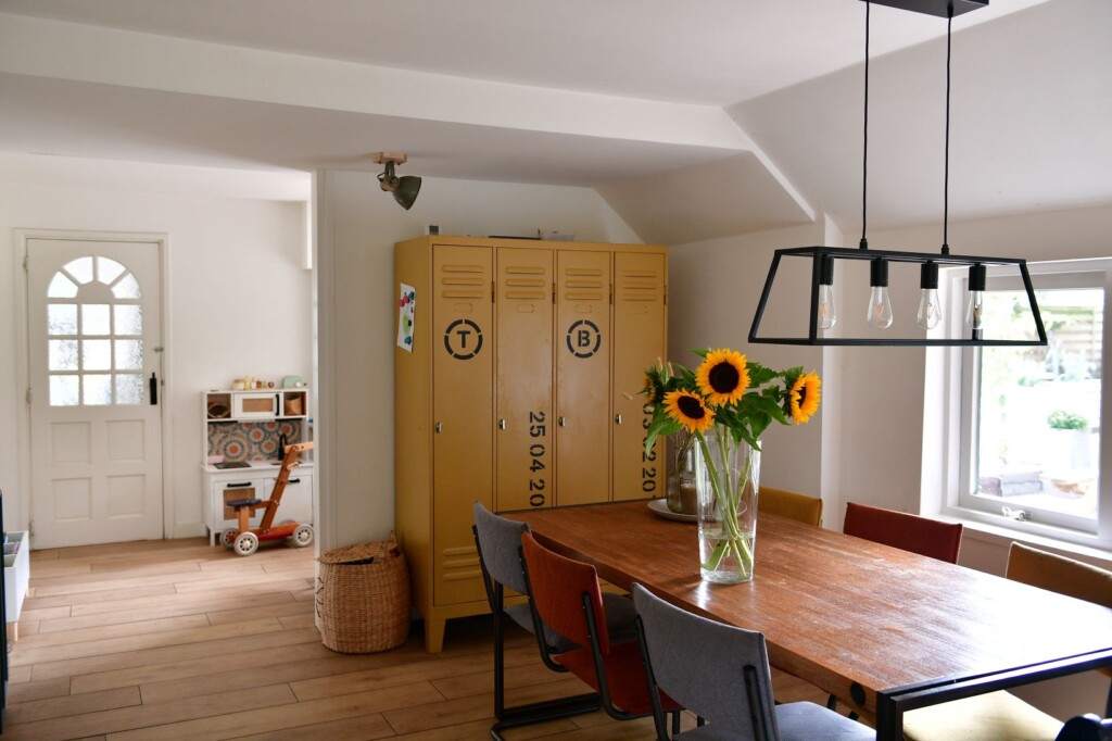 Het interieur is een mix van stoer, landelijk en heel eigen. Dat vertaalt zich in robuuste materialen en een warme, natuurlijke sfeer. Maar er is ook ruimte voor een knipoog: “Zoals die felgele lockerkast naast de eethoek. Past er eigenlijk niet bij, maar dat maakt het juist leuk. Het is óns huis.”