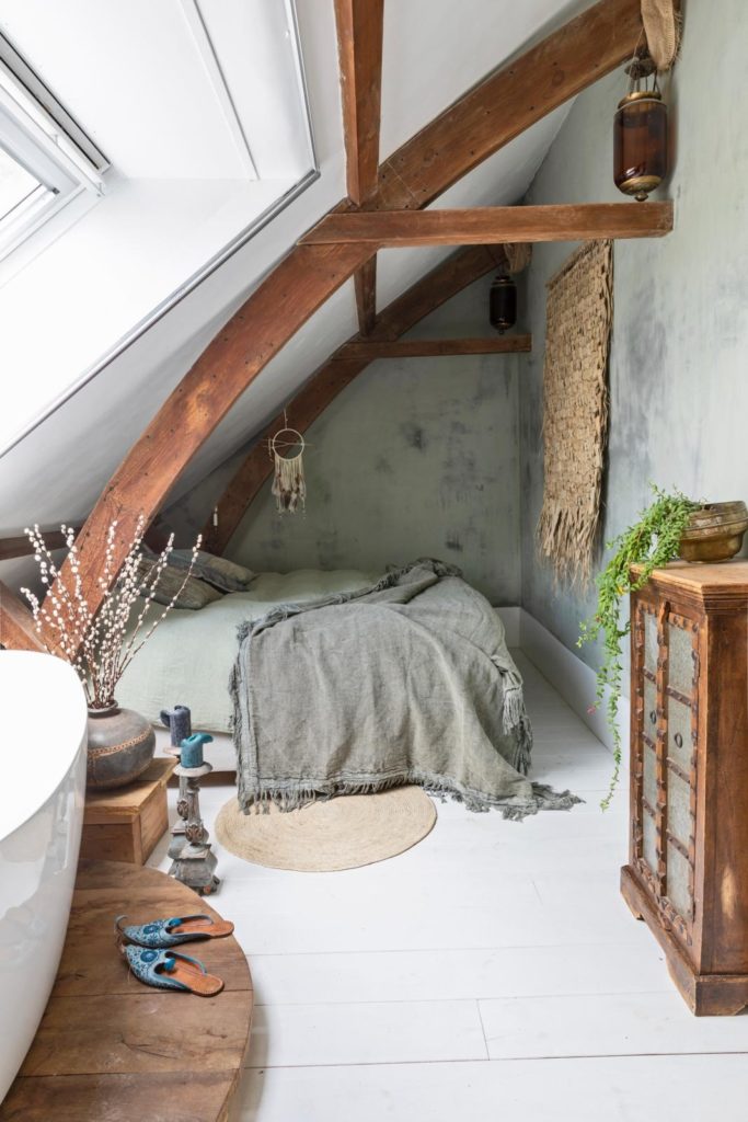 Slaapkamer van Arrad met vrijstaand bad onder de hanenbalken.