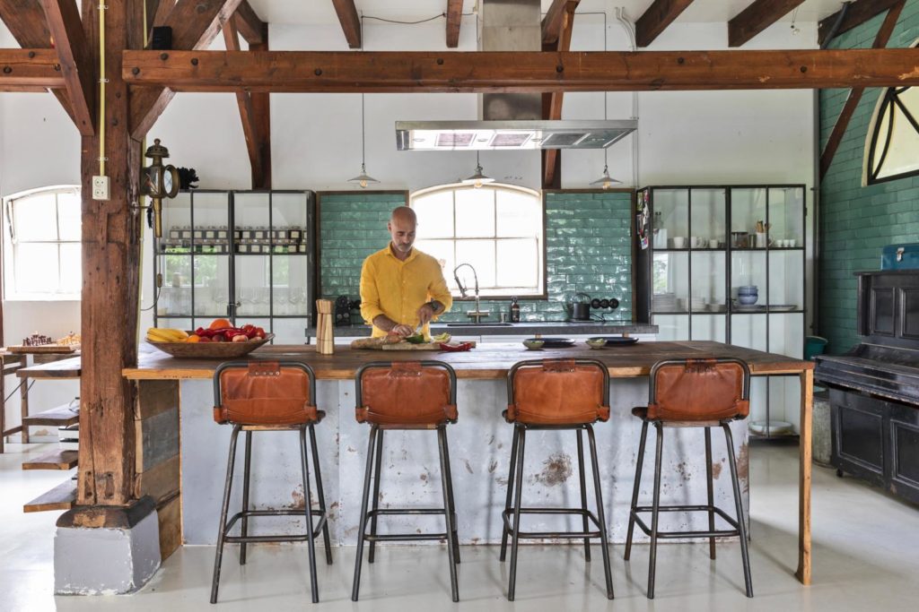 Ruim een halfjaar kostte het om van de stal een plek te maken waar hij ‘nooit meer weg wil’. “Zeven dagen per week, tien uur per dag terwijl ik er al woonde; het had niet veel langer moeten duren”, biecht hij op. De begane grond, 150 m2, heeft hij zoveel mogelijk open gelaten. De oude stalramen en de afgeronde schuurplekken in de knoestige palen waar het dak op rust, herinneren aan de eerste ‘bewoners’.
