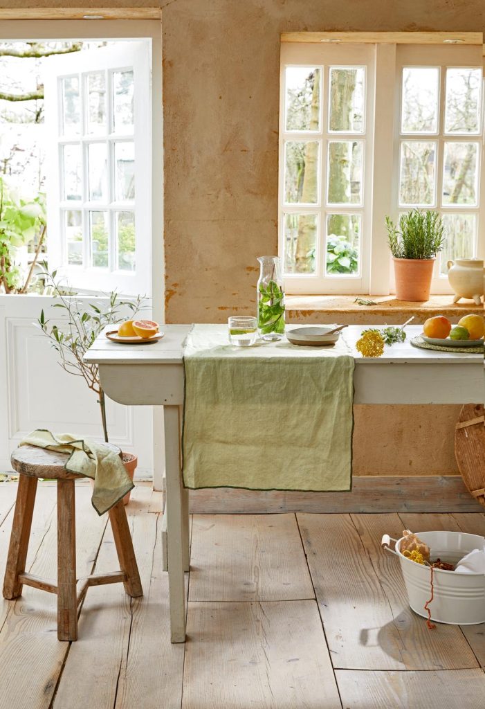 • Je hoeft niet altijd nieuwe stof te kopen, geef linnen servetten, theedoeken, een tafelloper, tas of broodzak een tweede leven en een nieuw fris kleurtje.
