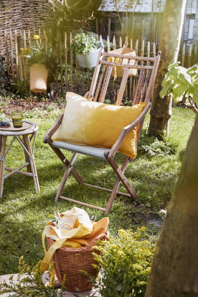 • Voor het verven van een witte linnen kussenhoes doe je 4 potjes kurkuma in een grote aluminium pan met water. Breng aan de kook, laat even sudderen en zeef het mengsel zodat je alleen het gekleurde vocht overhoudt.