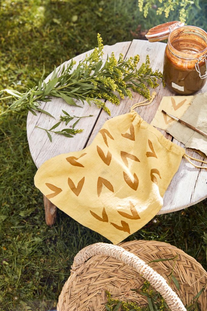 • Stempel of schilder met een kwast gedoopt in ijzerwater patronen op de stof. Afhankelijk van de concentratie ijzer in het water zal de kleur bruiner of grijzer worden. Ook dit is een kwestie van uitproberen.