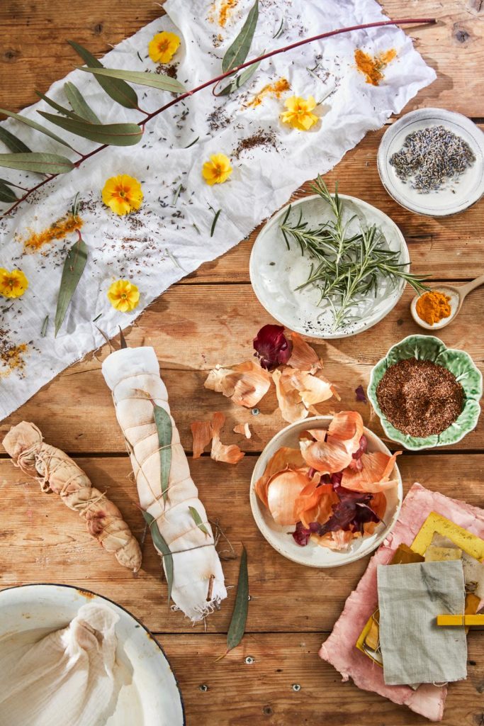 • Leg een lange strook vochtige linnen stof op een werkblad, bestrooi met diverse plantaardige materialen zoals rooibosthee, kurkuma, zwarte thee, gedroogde lavendel en rozemarijn en leg er een tak eucalyptus op en eventueel wat bloemen (zoals calendula). Rol stevig op en omwikkel met touw.