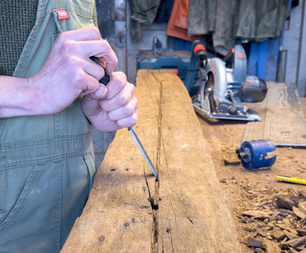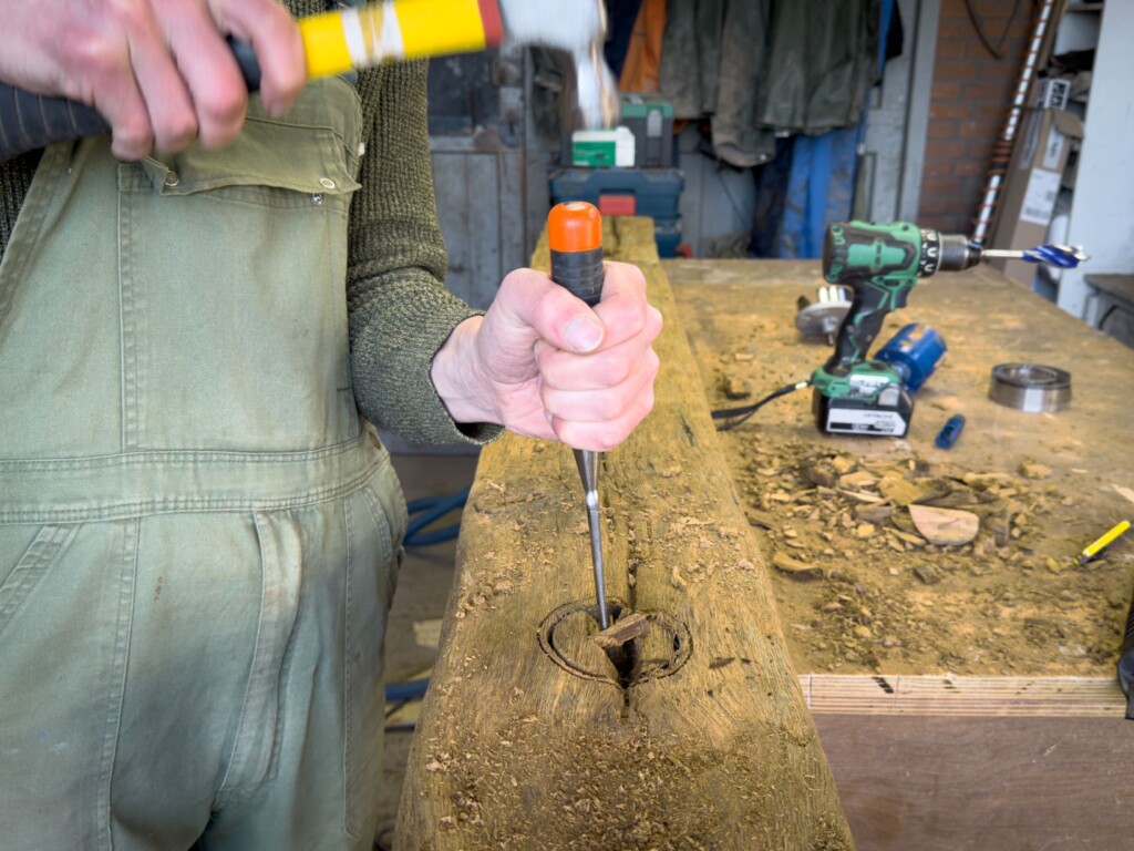 Haal met de beitel aan de rand van het boorgat een dun laagje hout weg, zodat daar de sierrand van het spotje in valt. Herhaal dit voor de overige twee spots.
