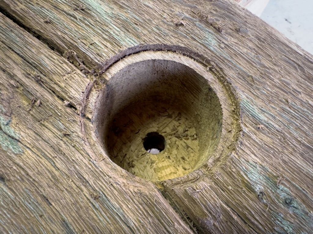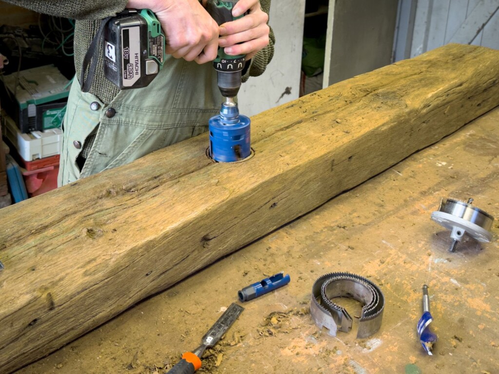 Boor met de 76 mm-gatenzaag licht in het hout, zodat de contour er goed in staat. Neem vervolgens een gatenzaag die net iets groter is dan de omtrek van het spotje. In dit voorbeeld 90 mm. Boor deze net zo diep als de rand van het spotje dik is. Boor vervolgens weer met de 76 mm gatenzaag tot deze niet dieper kan. Daarna boort u met een 25 mm speedboor de kern uit het boorgat. Tik met de beitel nu het resterende hout uit het boorgat; doordat de kern eruit is gaat dit eenvoudig. Maak de bodem vlak en controleer of het gat diep genoeg is. Neem de 18 mm gatenzaag wanneer u op diepte bent en boor nu helemaal door het hout heen. Dit gat is voor het snoer en dient als luchtkanaal zodat de hitte van het lampje weg kan.