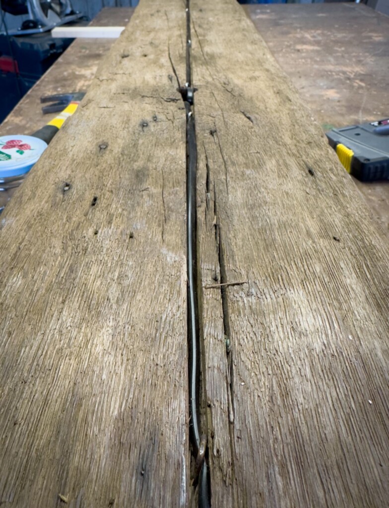 Maak aan de bovenzijde met een cirkelzaag twee gleufjes die net iets dieper zijn en net iets verder uit elkaar liggen dan het draad van de lampen dik is. Teken met potlood eerst rechte lijnen over de kleine gaten in de biels. Trek de lijn aan één zijde door tot het einde, stop aan de andere zijde bij het laatste gat. Verwijder met de beitel het strookje hout dat tussen de twee zaagsneden instaat.
