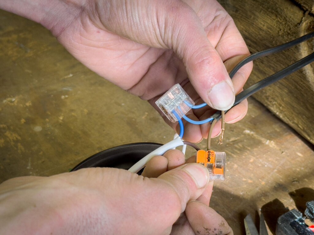 Gebruik twee lasdoppen, in de één steekt u de bruine draden, in de andere de blauwe draden. Omdat er drie draadjes met elkaar moeten worden verbonden is een drievoudige lasdop een betere optie dan een kroonsteen.
