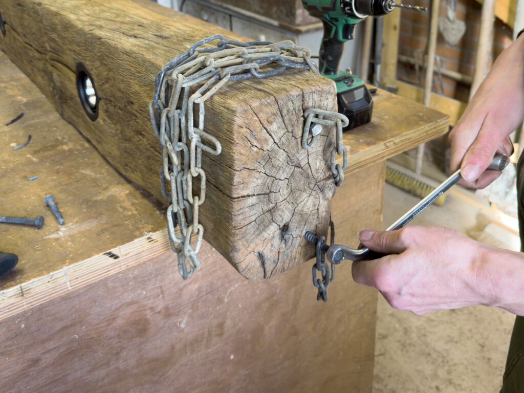 Steek de houtdraadbout door het laatste oog van de ketting en draai aan beide kopse kanten van de biels twee houtdraadbouten in het hout. Hoe u de ketting aan het plafond bevestigt is afhankelijk van de plek waar u de bielslamp wilt ophangen. Gebruik een stevige bevestiging, bijvoorbeeld met schommelhaken in een dikke balk. Door het gewicht is deze biels niet aan een gipsen plafond te bevestigen.