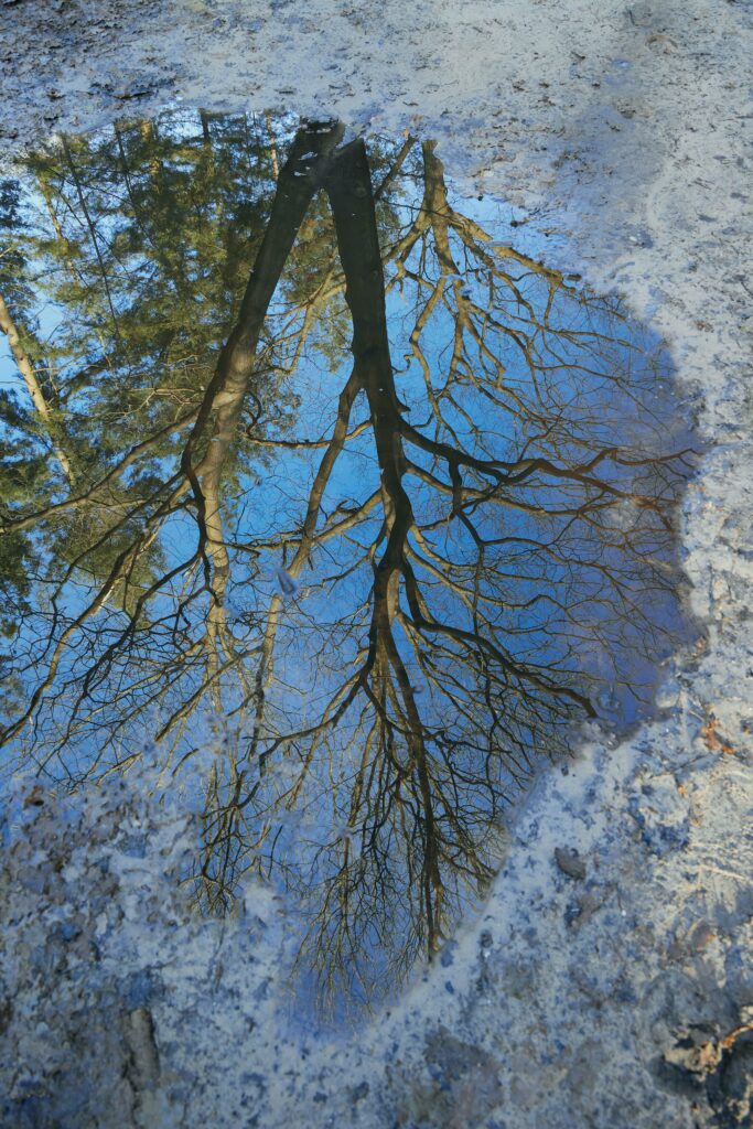 Een perfecte spiegeling. Door het wateroppervlak precies halverwege de hoogte van de foto te plaatsen is een mooie verticale symmetrie ontstaan.