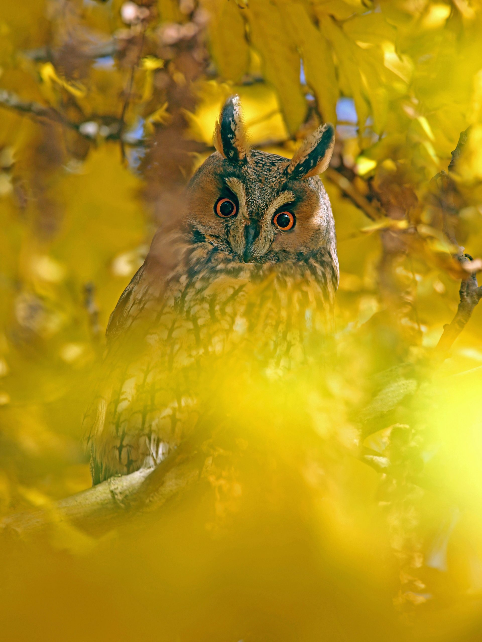 Avondlicht • Gerrie de With. Mooi dat de vorm van de wijd geopende ogen van de ransuil terugkeert in de lichtvlekken in de achtergrond. Perfecte compositie, veel spannender dan een centraal geplaatste uil.