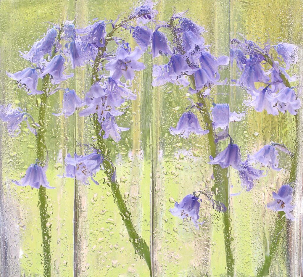 Lucie van Meteren – Blauwe boshyacintjes achter glas gefotografeerd