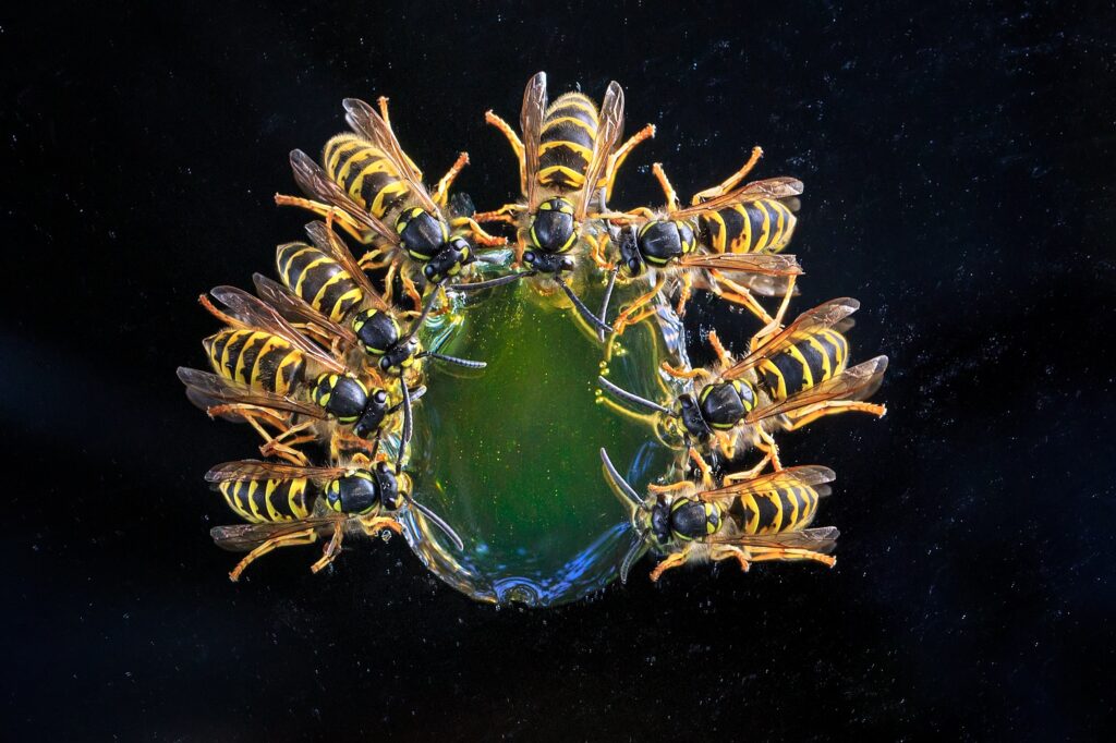 Johan Scholtens – 8 Wespen vormen een mooie cirkel rondom een druppeltje honing