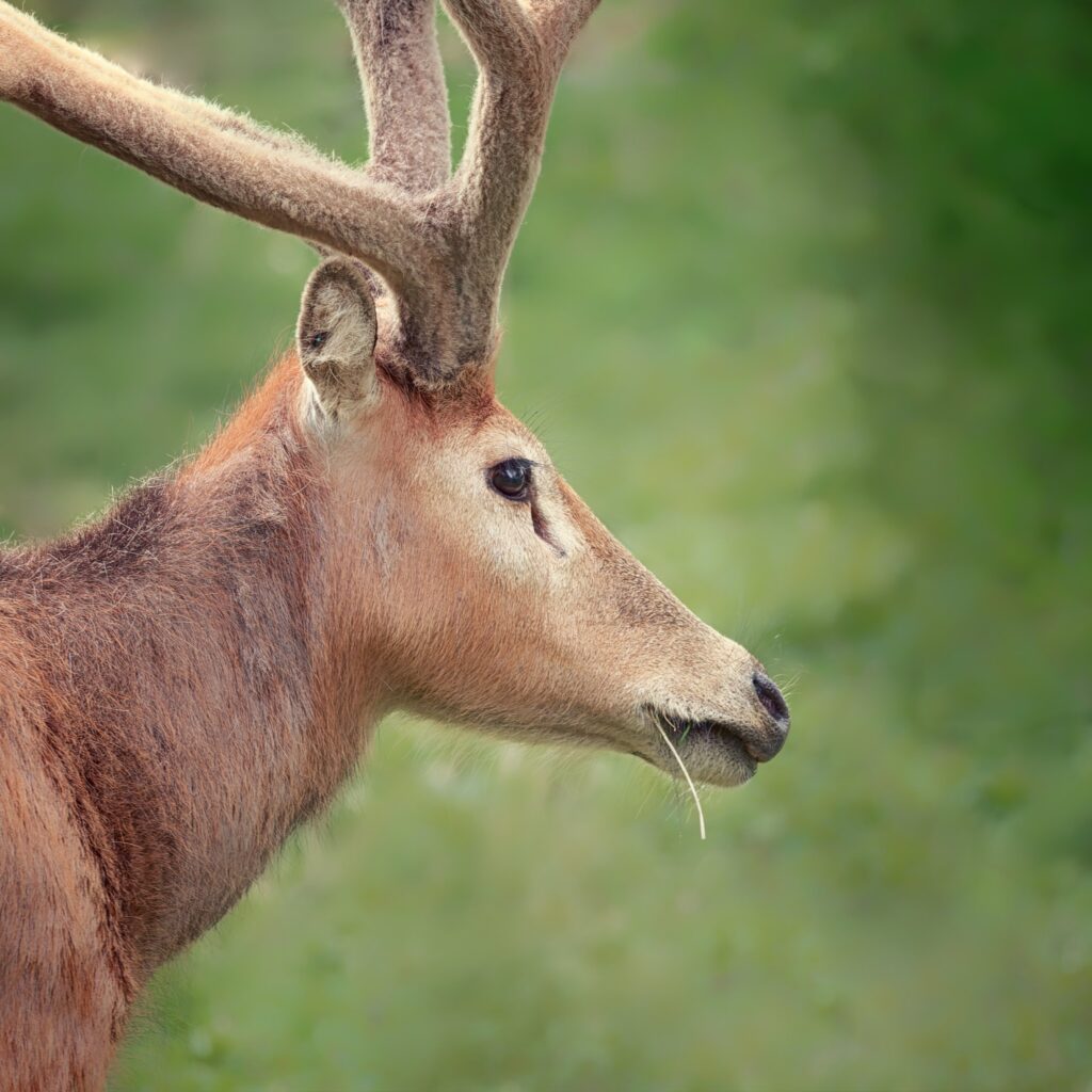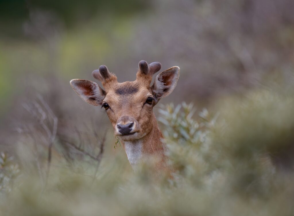 Deze foto heeft alles mee. De blik, het grasje in de bek, het fluweelachtige gewei en de struikachtige omgeving.