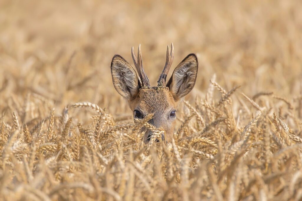 De combinatie van reeënvacht en korenaren is prachtig. Het oog dat net boven de aren uitsteekt is een leuk detail.