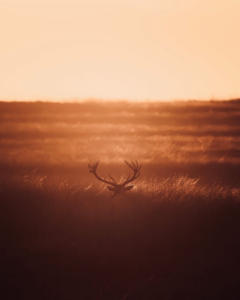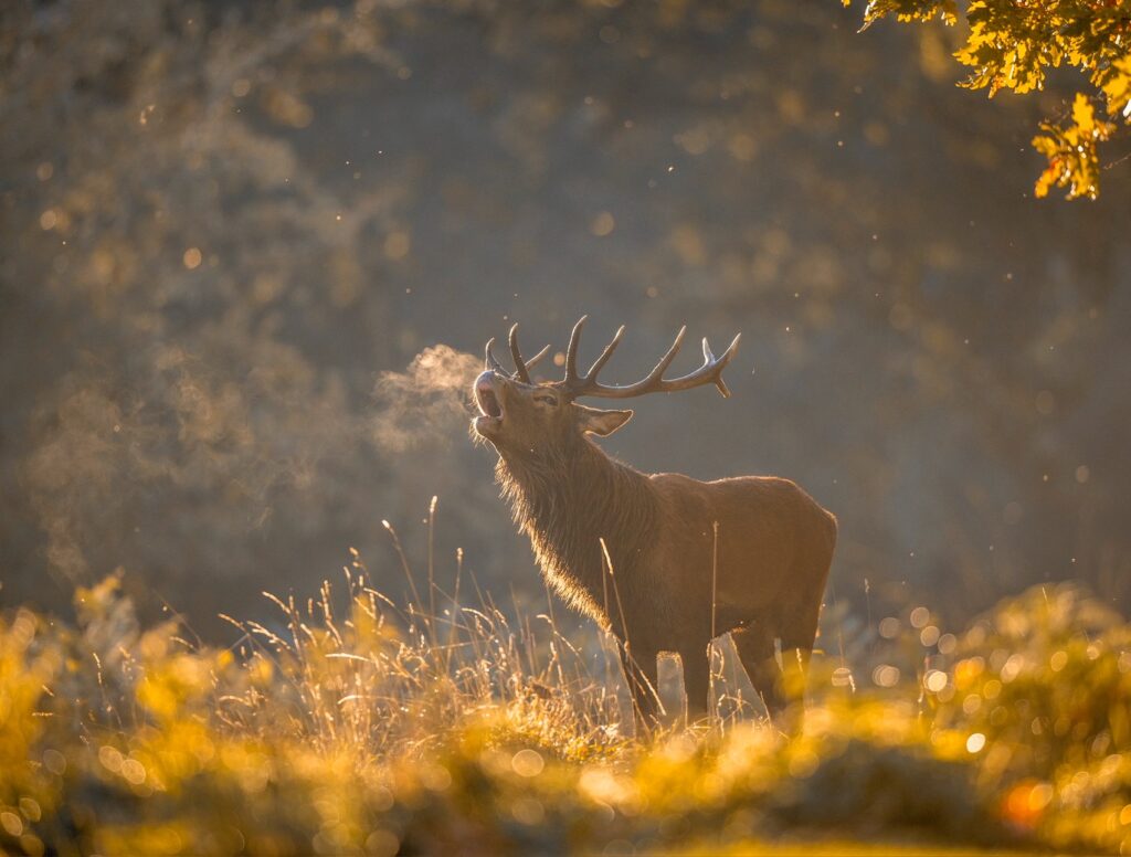 Het lage licht zorgt voor een fraai lichtcontour van het edelhert. De zichtbare ademwolk is perfect in beeld gebracht, de goudkleurige lichtvlekken maken het beeld compleet.