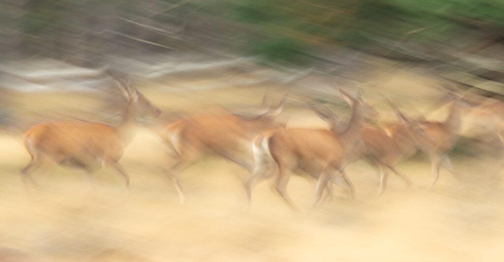Marry van der Geest – Een kudde rennende edelhert hindes