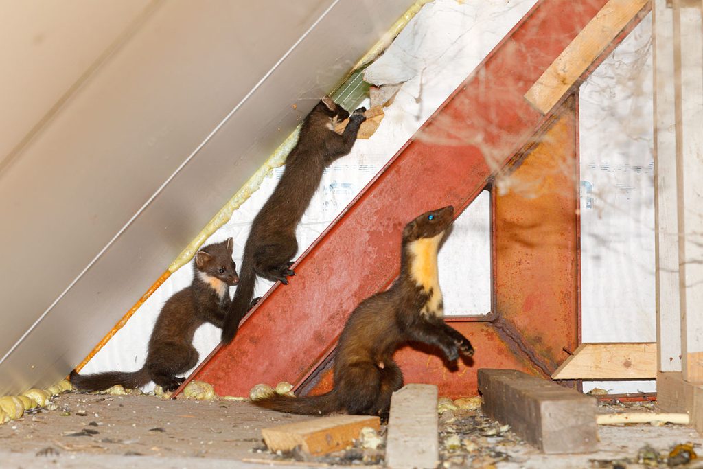 Dan hoor ik op een ochtend, terwijl ik plaatsneem achter mijn bureau, een klagend gepiep boven mijn kantoor. Subtiel, maar toch. Ik gris mijn telefoon en een hoofdlampje mee en klauter naar de vliering. Het gepiep houdt aan en al snel vind ik in een sleuf tegen de achtergevel, een kleine meter lager dan de vloer, drie hulpeloze welpjes. Tegen elkaar aan gekruld op een bed van afgeknaagde stukjes isolatieschuim, pasgeboren en met hun oogjes nog dicht. Het zijn jonge marterachtigen. Hoe bijzonder! Met mijn arm uitgestrekt in de sleuf maak ik snel een foto en terwijl ik daarmee bezig ben hoor ik de – naar ik aanneem – moeder een verdieping lager in een kabelgoot. Ik kan wel raden hoe ze zich voelt en verlaat zo stil mogelijk de vliering. Daarbij pak ik de wildcamera mee, de situatie is te delicaat en ik bezoek het nest voorlopig niet meer.