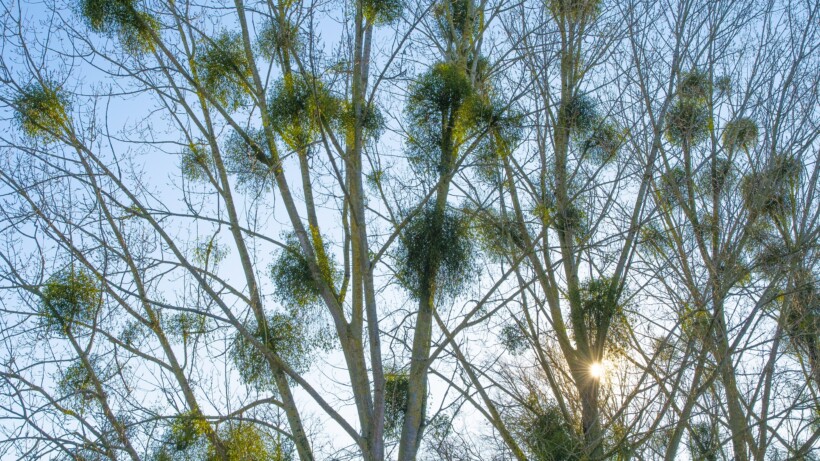 De mistletoe – of maretak zoals we hem meestal in Nederland noemen – is vooral bekend van kerst, waarbij we een takje met witte besjes boven een geliefde houden en die mogen kussen. De maretak behoudt het hele jaar z’n blad en groeit bolvormig. Prachtig, vooral in de herfst en winter als de groene bollen met witte besjes de kale bomen in het landschap opvrolijken. Om te zoenen, zo mooi!