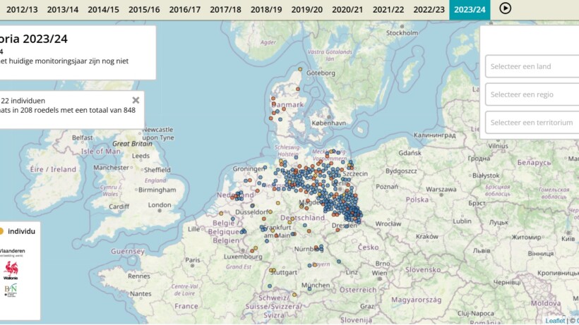 Op deze kaart zie je de verspreiding en voortplanting van wolven in de Benelux en Duitsland door de jaren heen. Vanwege de voorplantingscyclus van de wolf begint elk ‘wolvenjaar’ in mei en loopt tot en met april van het jaar daarop.