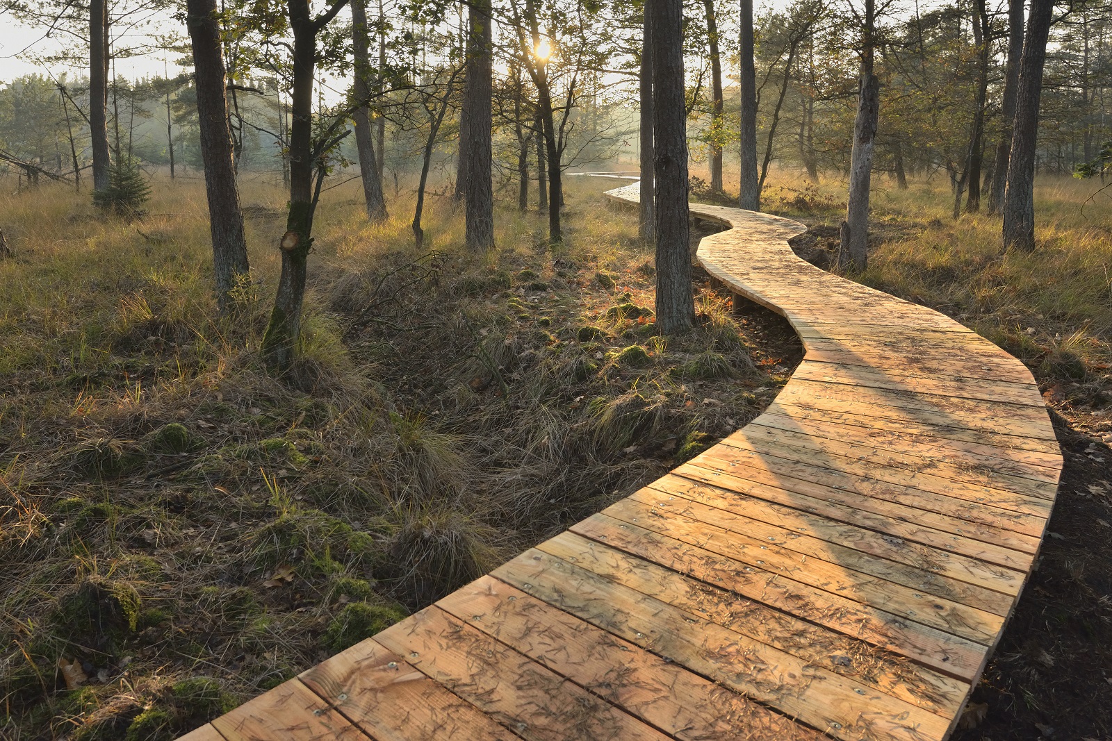 Langs goudgele Europese lariksen gaat de route. De lariks is trouwens de enige naaldboom in Nederland die in de herfst van groen naar geel kleurt en de naalden laat vallen. Langs een nieuw aangelegde poel gaat het, nauwelijks zichtbaar vanaf het wandelpad maar waar in de komende jaren zonnedauw en andere zeldzaamheden in alle rust kunnen groeien. Over een vers vlonderpad gaat het, slingerend tussen naaldbomen. Luijks: “Je vraagt je misschien af waarom het er ligt, maar in de winter staat hier gegarandeerd een laag water.” Langs graslandjes gaat het en langs rabatten, dat zijn walletjes langs geulen die werden gegraven om het water af te voeren. En langs akkers gaat het, die klaar en leeg zijn voor de winter. Erboven een wolk vogels in herfstnevelen. Onbegrijpelijk dat hier bijna niemand wandelt.