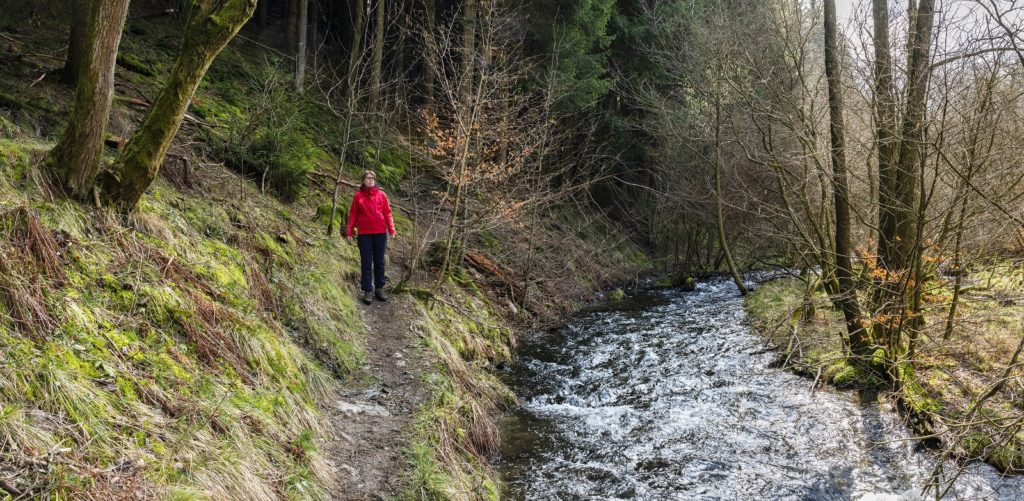 De Fuhrtsbach is het kleine zusje van de Perlenbach, maar daarmee niet minder fraai. Je ziet hier onder andere het zeldzame rood peperboompje, toefjes geel van de dotterbloemen, een enkele pinksterbloem en het onopvallende paarbladig goudveil. Het smalle pad wringt zich door een mosrijk naaldbos. Zodra de naaldbomen plaats maken voor loofbomen of voldoende licht toelaten, zijn daar meteen de eerste narcissen.