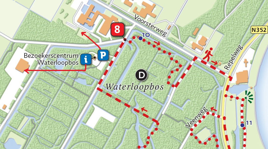 Net na punt 8 staan op de kaart een P-plaats en een bezoekerscentrum ingetekend. Zowel de P-plaats als het bezoekerscentrum is verplaatst. Zie kaart hieronder.