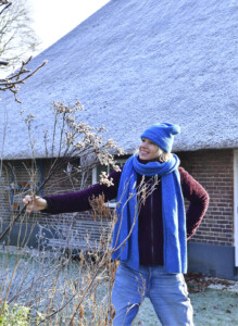 Rond, organisch, slingerend en romantisch”, de woorden die Sara Wink gebruikt om de vormentaal van haar tuinontwerpen te omschrijven nemen je al bijna mee op een wandeling over slingerende houtsnipperpaadjes, langs borders en onder bomen en berceaus door. Vooral in de wintertuin vindt de tuinontwerper die vormentaal belangrijk voor haar ontwerpen. “Een tuin moet uitnodigen, je meenemen, verrassen en nooit saai worden. Organisch gevormde borders waar je omheen en doorheen kan, die onder bomen doorslingeren en weer tegen een nieuwe border aanlopen, verschillende materialen op de grond, die maken van een tuin een echte belevingstuin. Een houtwal die mee slingert met het pad bijvoorbeeld, is een tuinelement dat weinig onderhoud vraagt, maar wel bijdraagt aan een spannend tuinbeeld en bovendien nuttig is voor het dierenleven in de tuin. Een gazon kan een saaie groene vlakte zijn, maar kan juist ook meehelpen om de ruimtelijkheid in een tuin te ondersteunen. Door er borders in te leggen, door hoog gras af te wisselen met kort gemaaid gras, of er een plant als kaardenbol in te laten groeien, kan dit statisch lijkend tuinelement meehelpen aan een spannende tuin. En zo mag je ook de hoogte indenken. Dat kan met een klassieke pergola, maar ook met gevlochten ornamenten die in bomen hangen. Een wilde clematis in een fruitboom verstrekt de winterbeleving van zo’n boom als hij met slingerende ranken versierd met pluisjes je blik omhoog trekt. Zo werken alle elementen van de tuin voor mij mee in de vormentaal van mijn ontwerpen.”