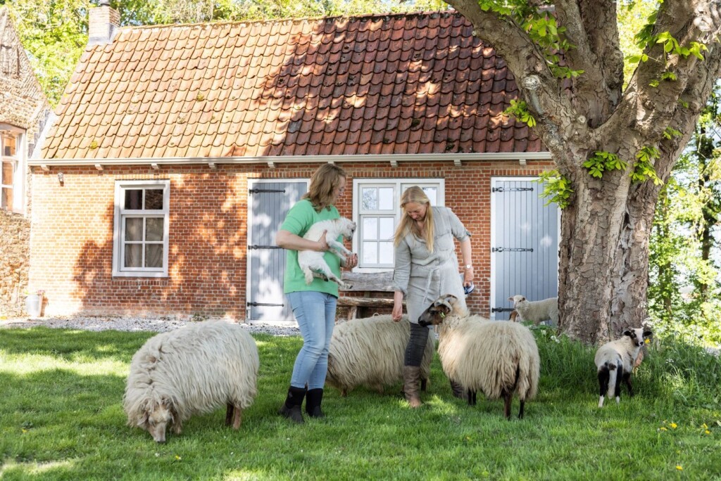 De helft van hun land, pakweg een hectare, is dijk. De tweede dijk op Tholen, vernoemd naar de tweede inpoldering die er plaatsvond. Maar al gauw nadat Marie-Cécile de Munck (56) en haar gezin hun intrek namen in ’t Ceciliahof, in het buitengebied van Sint Maartensdijk, bleek dat de dijk niet met een gewone tractor te maaien viel. “Mijn man zei: ‘Zullen we kijken naar wat er kan grazen?’” Met in gedachte dat bij een boerderij van pak ‘m beet 1650 ook levend erfgoed hoort, struinde Marie-Cécile negen jaar geleden het internet af op zoek naar een geschikt ras. “Verder dacht ik: wat groeit er hier en wat willen we kwijt? Distels en brandnetels. Je wilt ook geen ras waar je veel mee bezig moet zijn.” De keuze viel op het Drents heideschaap. “Een ras dat een beetje stoerder is, robuust. Het oudste ras ook, dat vinden we passend hier. Het leek ons wel wat. Al wist ik toen nog niet wat je met de vachten kunt doen, het gemêleerde van de Drenten sprak aan. Ze hebben allerlei kleurtjes.”