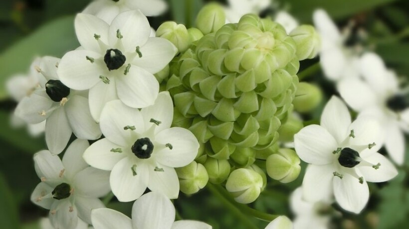 Aan het eind van de stengel van de zuidenwindlelie bloeit een tros witte kleine bloempjes, met middenin een zwart hart. De lieflijke witte bloemetjes van de bloem ontluiken één voor één: daarom heb je er, ook als snijbloem op een vaas, zo lang plezier van.